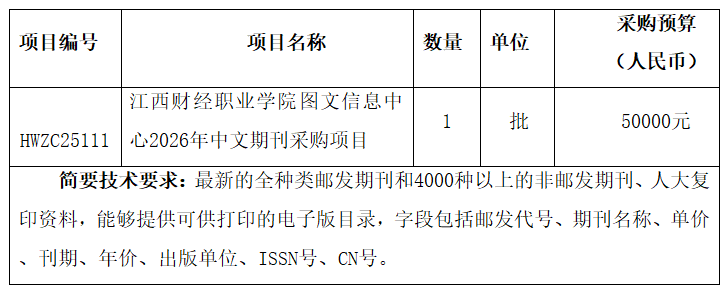 1.項目名稱:江西財經職業(yè)學院圖文信息中心2026年中文期刊采購項目
