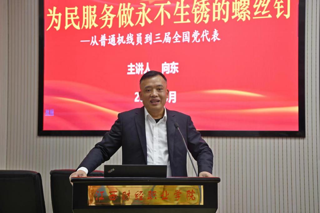 向東以自己由普通機線員到三屆全國黨代表的成長經歷,從始終把工作當作永遠的事業執著去堅守;堅持把向東班打造成群眾心中的卓越品牌;用真情回報社會、用愛心溫暖群眾;當好黨代表為基層群眾發聲四個方面生動地介紹了工作經歷以及參與組織愛心公益活動的歷程。與師生分享了自己成長的人生體會:一是不斷給自己設定目標;二是要有永不放棄的精神;三是堅持快樂工作的心態四是養成持續學習的習慣;五是永遠堅持心中的善良;六是不斷完善自我。