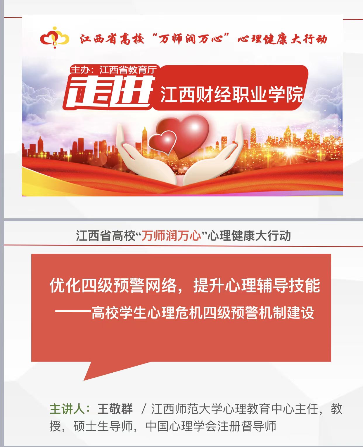 根據(jù)省教育廳《關(guān)于印發(fā)<全省高?!叭f(wàn)師潤(rùn)萬(wàn)心”心理健康大行動(dòng)實(shí)施方案>的通知》(贛教社政字〔2022〕10號(hào))文件精神,為進(jìn)一步優(yōu)化我校心理四級(jí)預(yù)警工作網(wǎng)絡(luò),提升學(xué)工隊(duì)伍心理輔導(dǎo)技能,促進(jìn)學(xué)生心理健康素養(yǎng)提升,5月29日下午,應(yīng)大學(xué)生心理健康教育中心邀請(qǐng),江西師范大學(xué)心理教育中心主任、碩士生導(dǎo)師、中國(guó)心理學(xué)會(huì)注冊(cè)督導(dǎo)師王敬群教授在英才交流中心作了一場(chǎng)題為《優(yōu)化四級(jí)預(yù)警網(wǎng)絡(luò),提升心理輔導(dǎo)技能——高校學(xué)生心理危機(jī)四級(jí)預(yù)警機(jī)制建設(shè)》的報(bào)告。校大學(xué)生心理健康教育中心負(fù)責(zé)人王美娟主持。