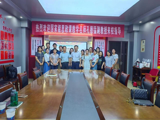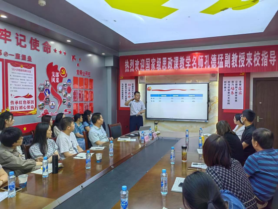 為推動學習貫徹習近平新時代中國特色社會主義思想主題教育走深走實,提升思政課教師教學能力,建設思政“金課”,6月3日,馬克思主義學院邀請國家級思政課教學名師、第二屆全國高校思政課教學展示“特等獎”獲得者、上海交通大學孔德猛副教授在綜合樓803會議室做《教學理念及教學設計——以“概論”課“鄧小平理論和中國特色社會主義開創”為例》的教學指導。活動由朱欣成名師工作室承辦,馬克思主義學院朱欣成院長主持,來自我校和九江職業技術學院、九江職業大學的部分思政課教師參加。