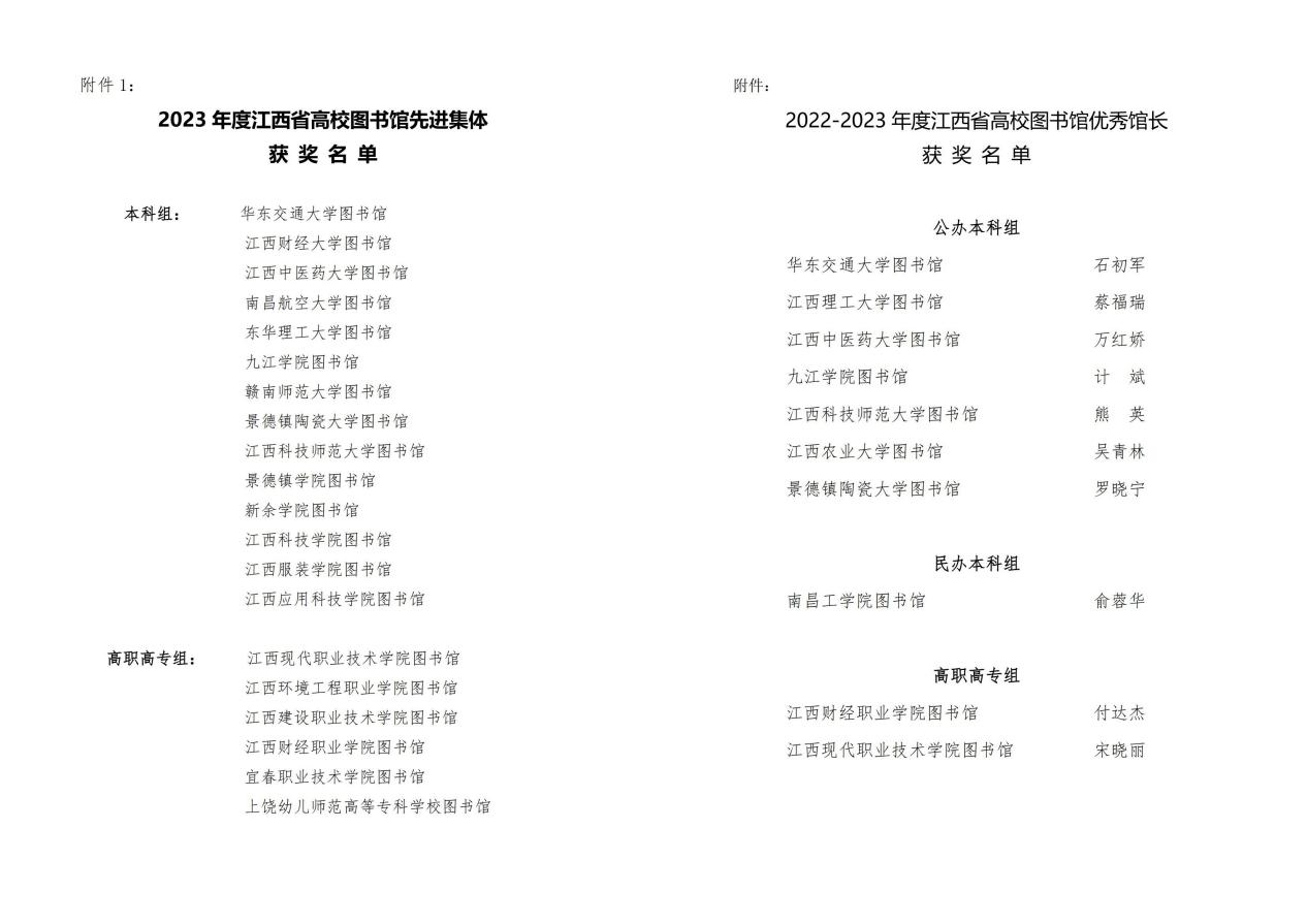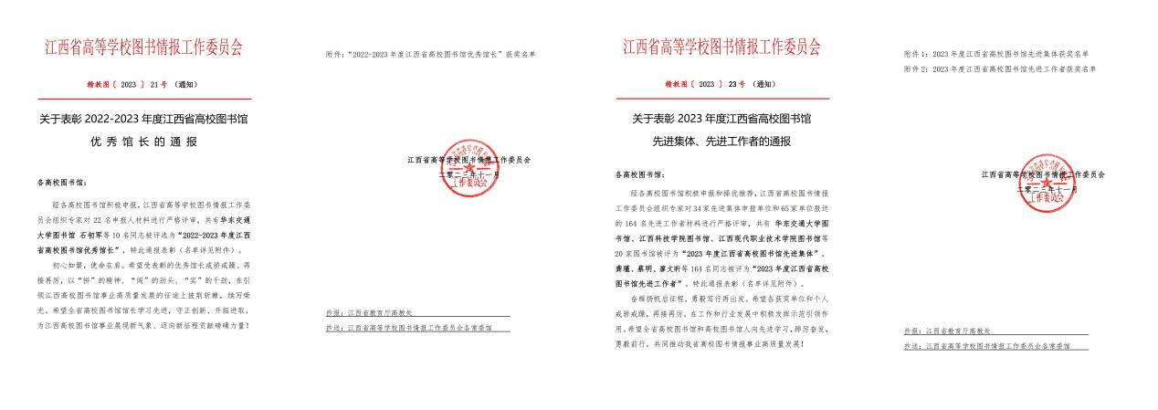 2023年11月8日,江西省高等學校圖書情報工作委員會下發了《關于表彰2023年度江西省高校圖書館先進集體、先進工作者的通報》(贛教圖〔2023〕23號)和《關于表彰2022-2023年度江西省高校圖書館優秀館長的通報》(贛教圖〔2023〕21號)。我校獲評2023年度江西省高校圖書館先進集體,全省僅6所高職高專院校獲此榮譽。我校圖文信息中心主任付達杰同志獲評2022-2023年度江西省高校圖書館優秀館長。圖文信息中心丁曉英、李鵬同志榮獲江西省高校圖書館先進工作者榮譽稱號。