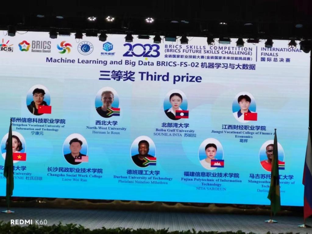 2023年11月10日,由南非高等教育與培訓部、金磚國家工商理事會、南非豪登省政府主辦;金磚國家工商理事會技能發(fā)展工作組、南非高等教育與培訓部媒體信息通信技術署承辦;金磚國家工商理事會(中方)技能發(fā)展工作組、“一帶一路”暨金磚國家技能發(fā)展國際聯盟、教育部中外人文交流中心為中方組織單位;金磚國家工商理事會(巴西、俄羅斯、印度)技能發(fā)展工作組為協辦單位;廣安職業(yè)技術學院為中方執(zhí)行承辦單位;重慶翰海睿智大數據科技股份有限公司作為技術支持單位為賽項提供技術保障的“2023金磚國家職業(yè)技能大賽機器學習與大數據賽項國際總決賽”在四川廣安落幕,前期經過華東區(qū)域賽的角逐,我校成功突圍代表中國參加國際總決賽,本次國際總決賽吸引來自13個國家共計110支隊伍參賽,經過三天的角逐,由我校信息工程學院王奎老師指導的21軟件4班葛輝同學榮獲該項賽事三等獎。