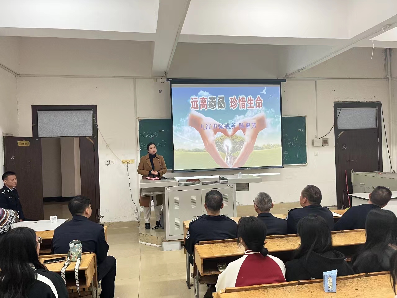 為了提升大學生的防毒意識,發揮學校教育在毒品預防活動中的重要作用,構建和諧、平安、文明校園,11月15日,馬克思主義學院邀請思政教育基地共建單位——九江市強制戒毒所陳惠芳大隊長在綜合樓階梯四教室舉辦以“遠離毒品 珍惜生命”為主題的毒品預防知識講座,馬克思主義學院院長朱欣成、九江市強制戒毒所二級高級警長呂任奎、教育科科長徐東濤、教育矯正中心主任葛偉、心理矯治中心主任吳志兵、康復訓練中心主任伍海峰等參加。講座由馬克思主義學院副書記熊曉蘭主持,22級與23級部分同學參加。