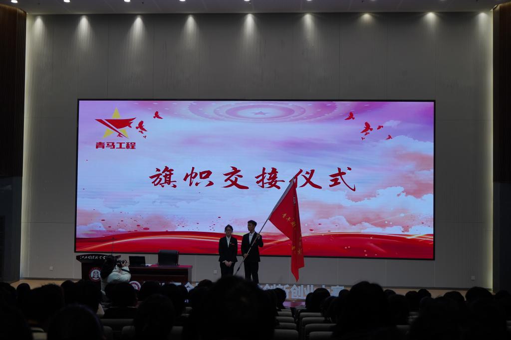 開(kāi)班儀式在嘹亮的國(guó)歌聲中拉開(kāi)序幕。新一期的學(xué)員們共同觀看了上一期大骨班的培養(yǎng)培訓(xùn)工作視頻。隨后,徐穎介紹了開(kāi)班情況,并宣讀了培訓(xùn)紀(jì)律和考核要求。來(lái)自現(xiàn)代服務(wù)學(xué)院和經(jīng)濟(jì)貿(mào)易學(xué)院的曹江川、金歡同學(xué)分別代表新老學(xué)員發(fā)言并進(jìn)行莊嚴(yán)的旗幟交接儀式,飄揚(yáng)的旗幟象征著大骨班吐故納新,薪火相傳。