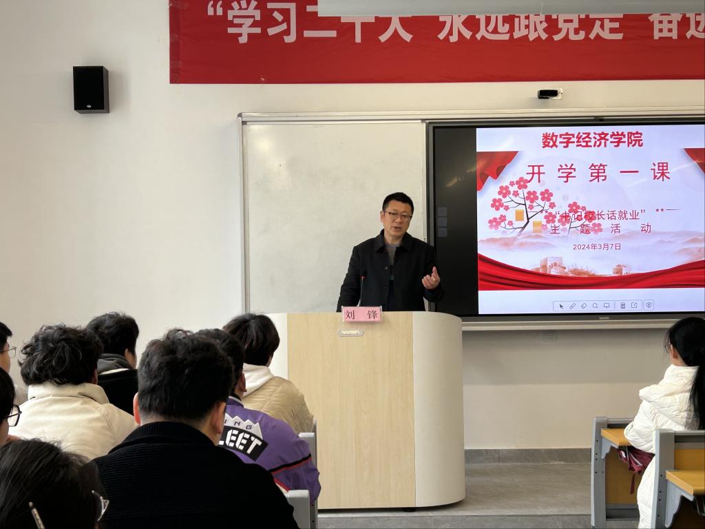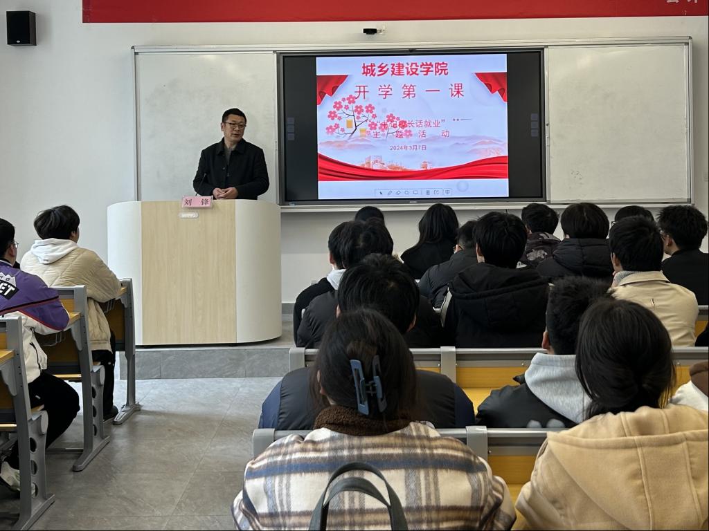 為深入貫徹落實黨中央、國務院及學校關于促進畢業就業工作的決策部署,幫助在校生樹立正確就業觀,培養良好就業心態,2024年3月7日下午,校黨委委員劉鋒在八里湖校區一號教學樓306室,以就業為主題,為城鄉建設學院、數字經濟學院學生講授開學第一課。