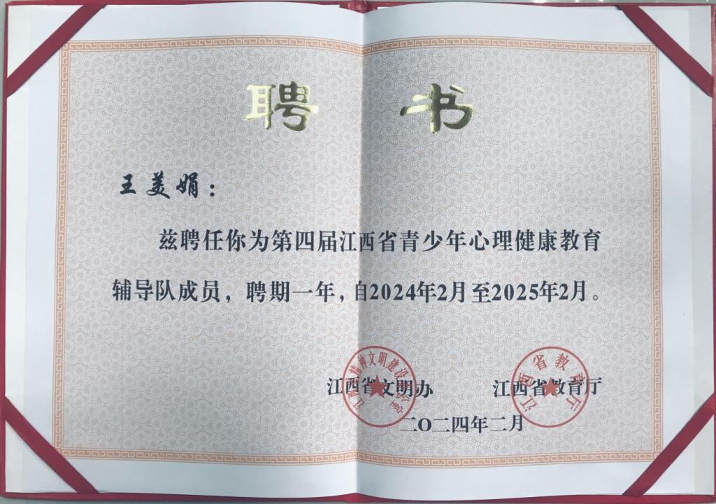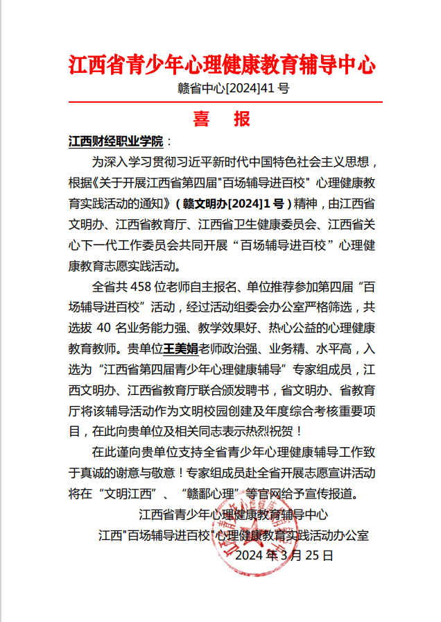 我校王美娟老師積極報名參加本次活動專家教師遴選,經學校審核推薦后上報江西“百場輔導進百校”心理健康教育實踐活動辦公室。據悉,全省共有458位老師自主報名、單位推薦參加本次遴選。經過活動組委會辦公室嚴格篩選,共選拔40名業務能力強、教學效果好、熱心公益的心理健康教育教師。我校王美娟老師成功入選為“江西省第四屆青少年心理健康輔導”專家組成員!