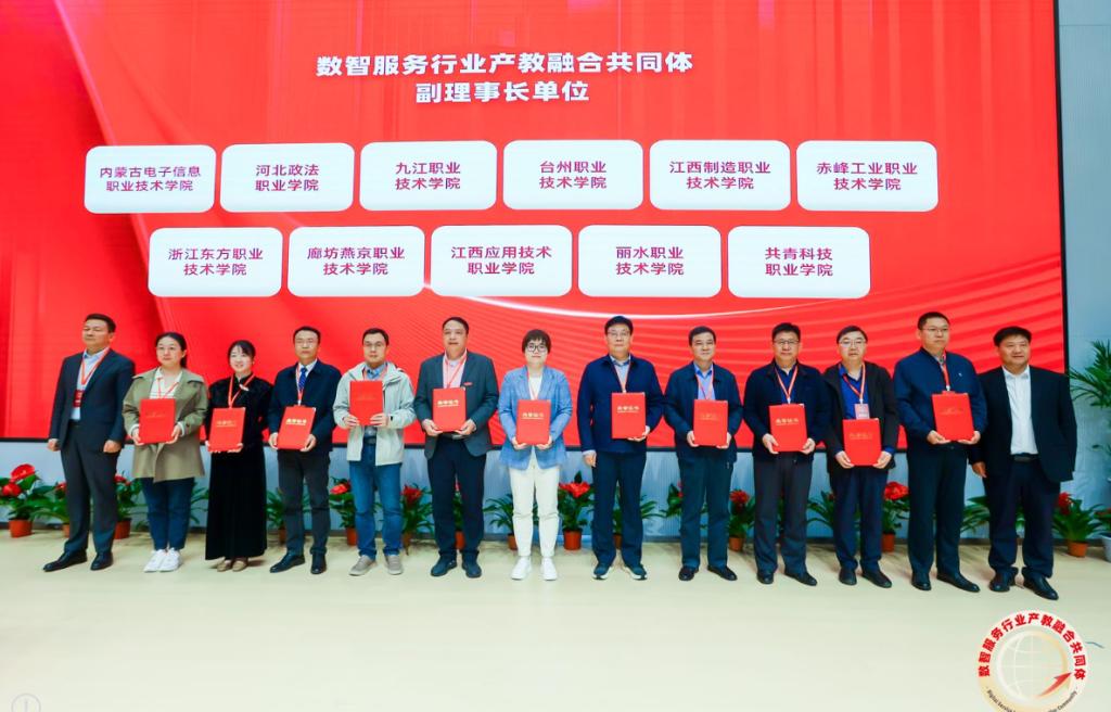 杜少華、夏維紅、田鵬、周建松、劉彪文、袁宏亮等一同按下數字按紐,宣布數智服務行業產教融合共同體正式成立。