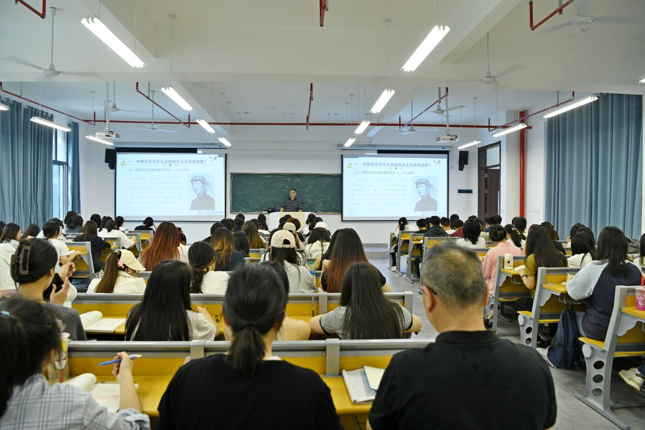 課堂上,陳圣鋼教授圍繞“中國革命為什么走新民主主義革命道路”這一專題進行講解,結合國情,向學生講述了統一戰線、武裝斗爭、黨的建設三大法寶,以及新民主主義革命的道路和基本經驗。陳老師授課聲情并茂、史論結合,積極與學生互動交流,幫助學生更加全面了解新民主主義革命理論的重要意義,并結合學習貫徹黨的二十大精神,啟發同學們要加強理論學習,珍惜幸福生活,堅定“四個自信”。
