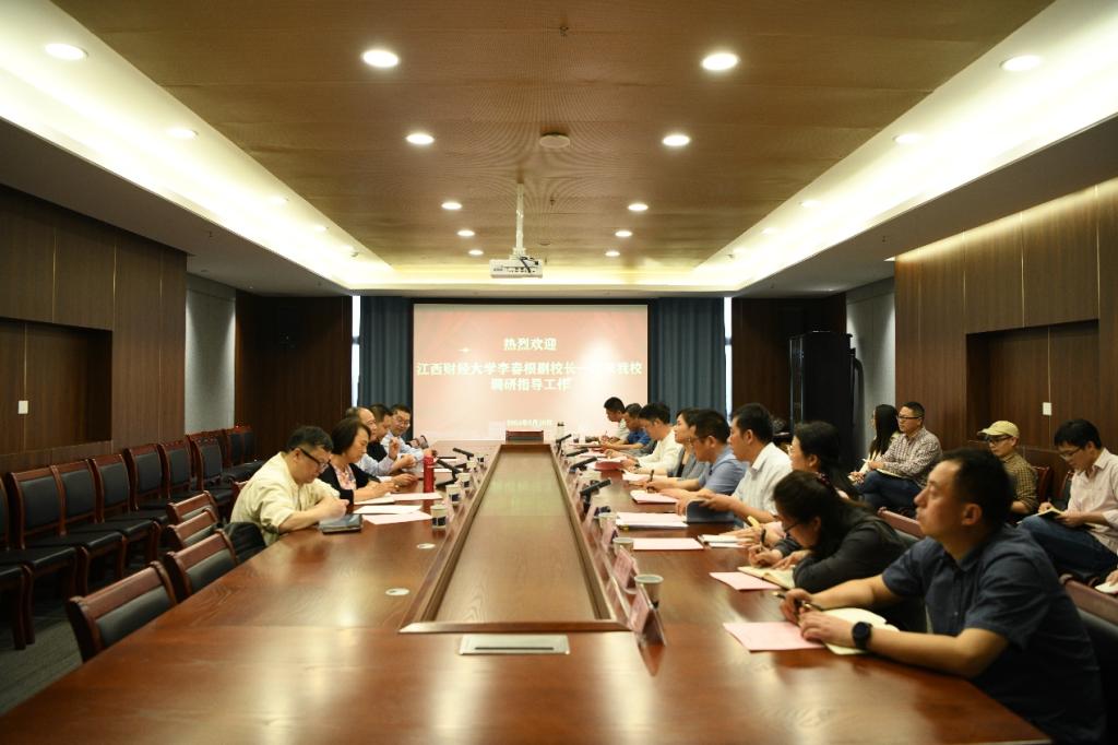 5月10日,江西財經大學黨委常委、副校長李春根帶隊來我校對聯培本科生就業,教學與學生管理情況進行調研指導。江西財經大學教務處、招生就業處、金融學院、工商管理學院等單位負責人參加調研指導。我校黨委副書記、校長彭慧在八里湖校區行政樓727會議室熱情接待了李春根副校長一行。黨委委員劉鋒,招生就業處、教務處、本科部、相關二級學院主要負責人及班主任代表參加本次調研座談會。