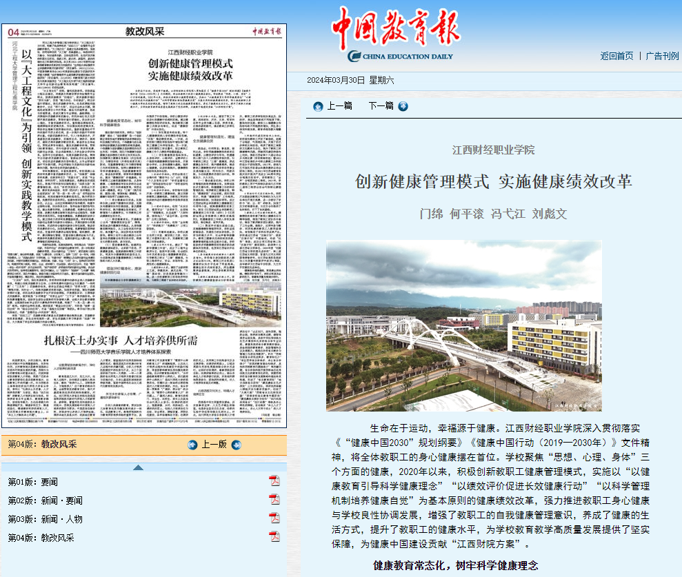 3月30日,中國教育報04版刊登了《江西財經職業學院創新健康管理模式 實施健康績效改革》。