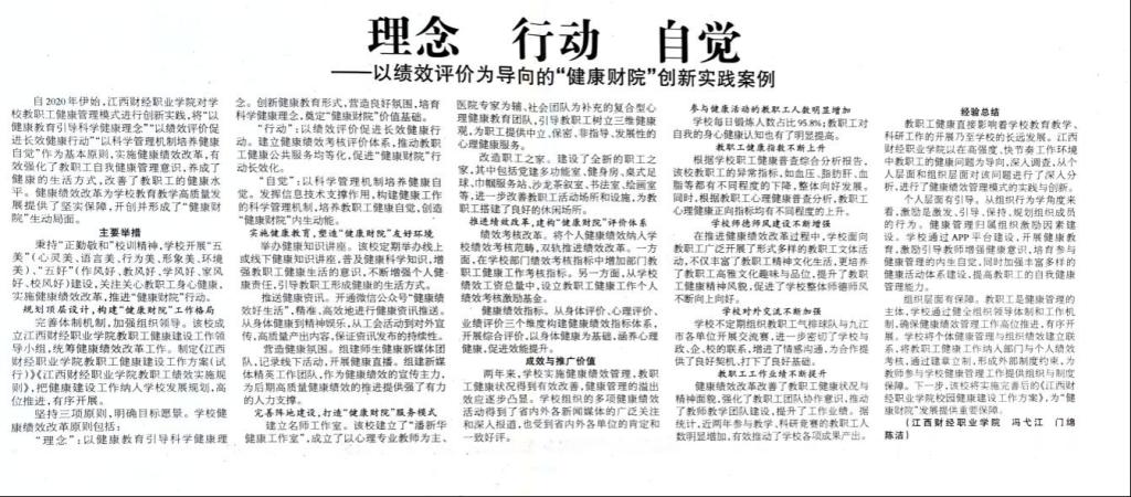 5月11日,江西工人報03版刊登了我校《理念 行動 自覺——以績效評價為導向的“健康財院”創新實踐案例》。