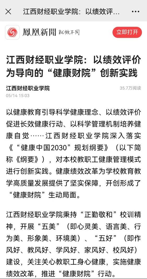 5月14日,鳳凰新聞刊登文章《江西財經職業學院:以績效評價為導向的“健康財院”創新實踐》。