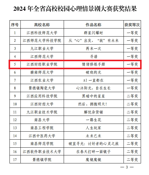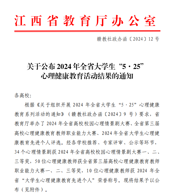 近日,江西省教育廳辦公室印發(fā)了《關(guān)于公布2024年全省大學(xué)生“5·25”心理健康教育活動結(jié)果的通知》(贛教社政辦函〔2024〕12號),由我校王美娟、張亦弛、吳菁菁老師指導(dǎo),張樂、胡著濤、嚴劍晨等二十余名同學(xué)的原創(chuàng)劇目《情緒修煉手冊》喜獲2024年江西省高校心理情景劇大賽一等獎。我校大學(xué)生心理健康教育中心負責人王美娟獲得2024年江西省大學(xué)生“心理健康教育先進個人”榮譽稱號。