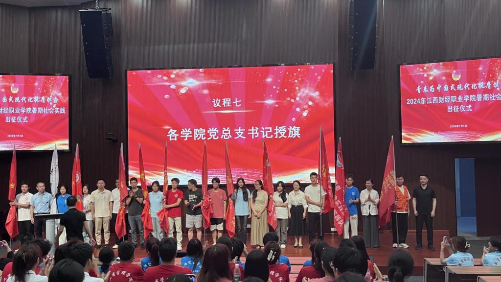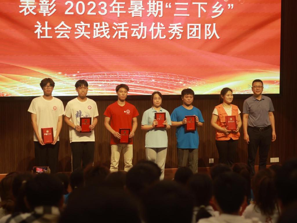 出征儀式上,劉鋒為獲得2023年暑期社會(huì)實(shí)踐省市級(jí)優(yōu)秀團(tuán)隊(duì)及個(gè)人頒獎(jiǎng),各黨總支負(fù)責(zé)人為2024年暑期社會(huì)實(shí)踐活動(dòng)各團(tuán)隊(duì)授旗,教師代表宋亞男、學(xué)生代表袁翔分別發(fā)言,并播放了2023年暑期“三下鄉(xiāng)”社會(huì)實(shí)踐活動(dòng)紀(jì)錄片。