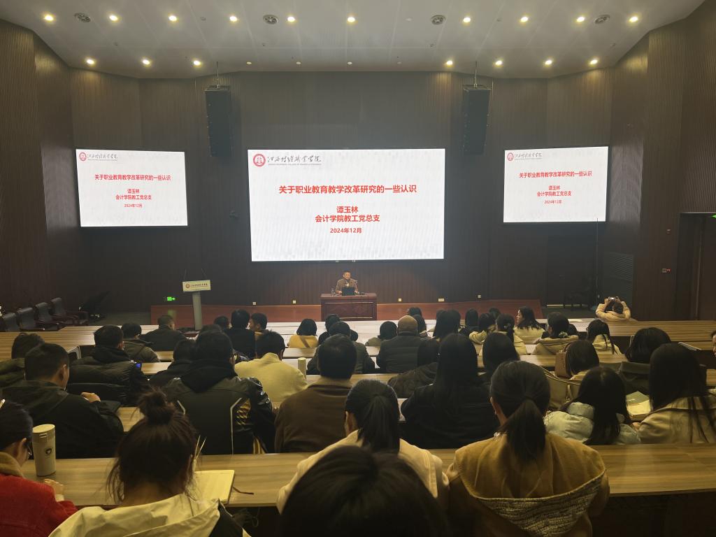 12月4日,我校在八里湖校區行政樓二號報告廳舉辦了“師說講堂”系列活動,會計學院副院長譚玉林作“職業教育教學改革研究的一些認識”專題報告,副校長馮弋江出席活動,會計學院、數字經濟學院全體專兼職教師100余人參會,報告會由教務處副處長龔少卿主持。