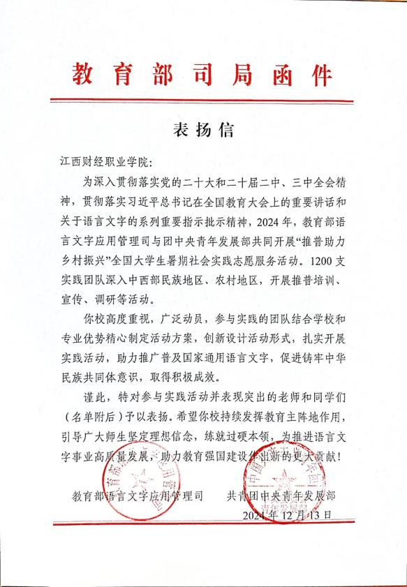 近日,教育部語言文字應用管理司和共青團中央青年發展部共同向我校發來表揚信,充分肯定并表揚了我校在“推普助力鄉村振興”志愿服務活動中的突出表現和取得的積極成效。