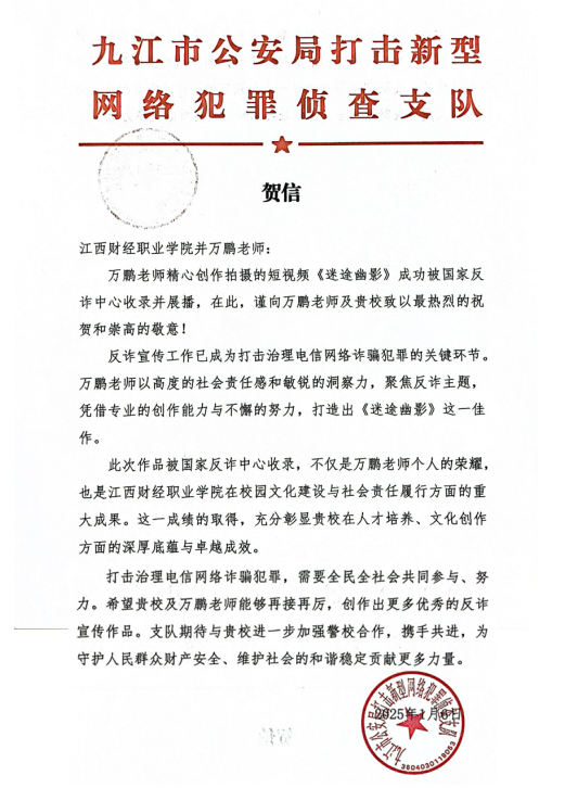 日前,由我校信息工程學院萬鵬老師領(lǐng)銜的“ONE影像大師工作室”創(chuàng)作的短視頻作品《迷途幽影》成功入選國家反詐中心平臺,并在抖音、快手、視頻號、微博等全平臺展播。1月6日,九江市公安局打擊新型網(wǎng)絡犯罪偵查支隊向?qū)W校發(fā)來賀信,賀信對學校和萬鵬老師為反詐行動所做出的貢獻表達了崇高的敬意。這一佳績充分體現(xiàn)了學校在深化創(chuàng)新創(chuàng)業(yè)教育改革過程中的最新成果,也彰顯了學校在社會服務中的責任與擔當。