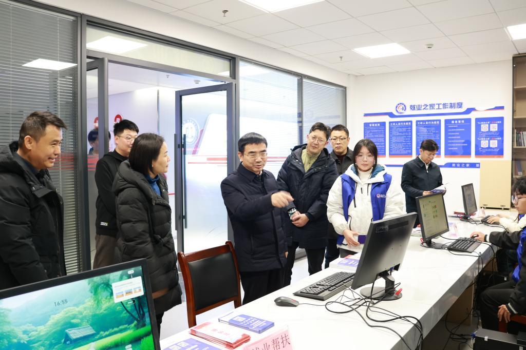 蔣文定一行來到我校5+2就業(yè)之家,實(shí)地查看一站式就業(yè)服務(wù)大廳、就業(yè)直播間、大數(shù)據(jù)分析室等,認(rèn)真聽取相關(guān)情況匯報(bào),詳細(xì)了解學(xué)校人才培養(yǎng)、就業(yè)指導(dǎo)、創(chuàng)業(yè)服務(wù)等情況,饒有興致地體驗(yàn)“智慧求職機(jī)”認(rèn)證授權(quán)、崗位查詢等功能,并與正在備戰(zhàn)大學(xué)生職業(yè)規(guī)劃大賽的師生親切互動(dòng)。