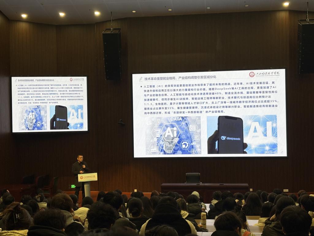 為深入貫徹黨中央、國務院決策部署,推動落實畢業生就業工作“一把手工程”,提升畢業生就業競爭力和就業質量,3月11日下午,校黨委委員劉鋒在八里湖校區行政樓二號報告廳,為城鄉建設學院、數字經濟學院、信息工程學院學生作“開學就業第一課”主題報告。