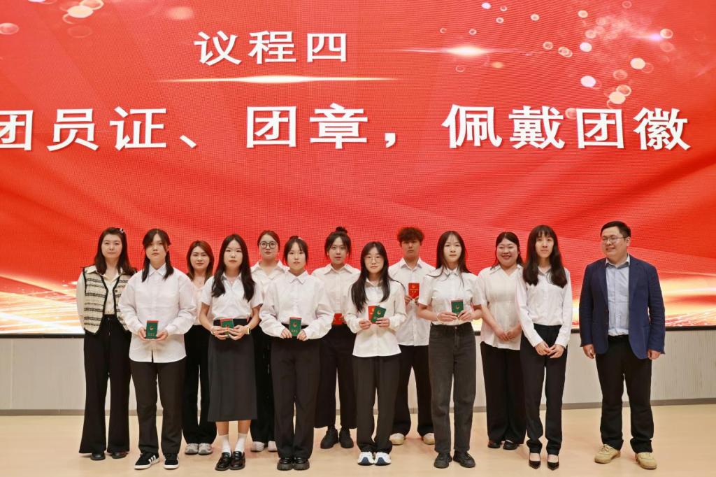 隨后,歌曲《強國一代有我在》將大家帶入了入團儀式環節。各團總支書記為新團員頒發了團員證、團章并佩戴團徽;全體新老團員面向團旗,高舉右拳莊嚴宣誓:“我志愿加入中國共產主義青年團……”鏗鏘誓言響徹會場,彰顯著新時代青年賡續紅色基因的堅定決心;優秀學生團干代表經濟貿易學院淦方宇、新團員代表工商管理學院周俊分別分享了自己的青春成長感悟。