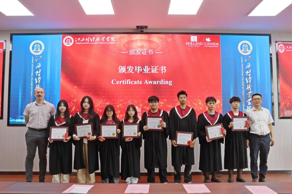 典禮上,中加雙方院校領導為畢業生頒發了畢業證書和紀念品,并合影留念。