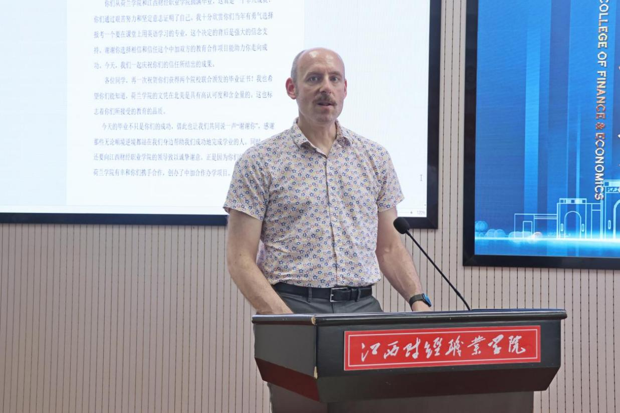馮弋江在致辭中介紹了學校近年來的國際化辦學成果,對遠道而來的加拿大荷蘭學院教務長Craig Dauphinee一行表示熱烈歡迎,對兩校老師在項目實施過程中付出的努力表示真摯的感謝,并表達了對畢業生的美好祝愿。他希望同學們以世界為課堂、永葆探索熱忱,以文化為紐帶、勇擔時代使命,以奮斗為底色、書寫青春華章,在全球化浪潮中勇立潮頭,秉承“正、勤、敬、和”校訓精神,努力成長為德才兼備、具有國際競爭力的新時代人才。