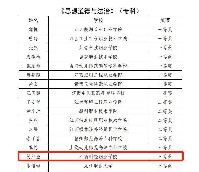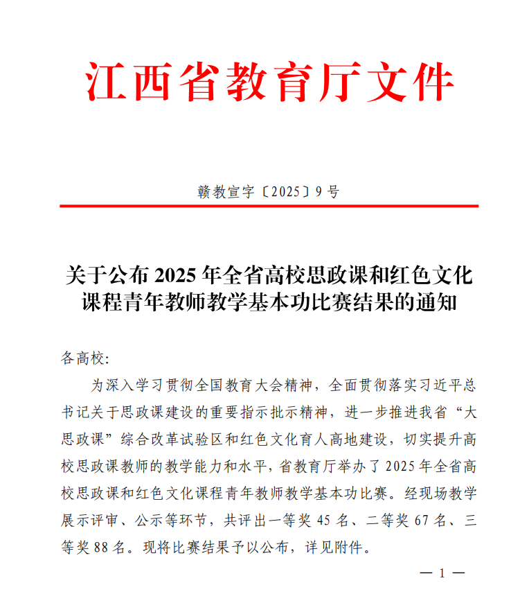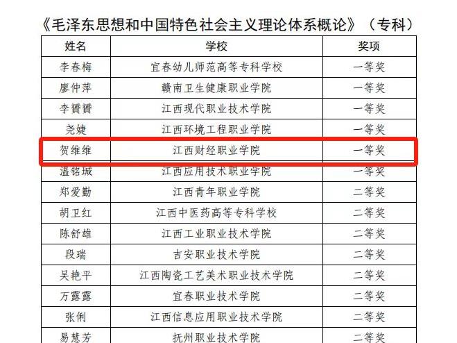 近日,由中共江西省委教育工委、江西省教育廳舉辦的2025年度全省高校思政課和紅色文化課程教學比賽結果公布。經過激烈角逐,我校兩位思政課教師在比賽中榮獲佳績,其中,賀維維榮獲“毛澤東思想和中國特色社會主義理論體系概論”課專科組一等獎,吳紅金獲“思想道德與法治”課專科組三等獎。
