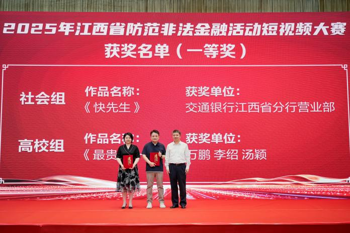 6月13日晚,在2025年江西省防范非法金融活動(dòng)短視頻大賽頒獎(jiǎng)典禮上,由我校師生聯(lián)合創(chuàng)作的短視頻作品《最貴的一課》榮獲高校組一等獎(jiǎng),學(xué)校獲優(yōu)秀組織獎(jiǎng)。江西省委常委、省政府黨組副書(shū)記、常務(wù)副省長(zhǎng)任珠峰為獲獎(jiǎng)單位頒獎(jiǎng)。