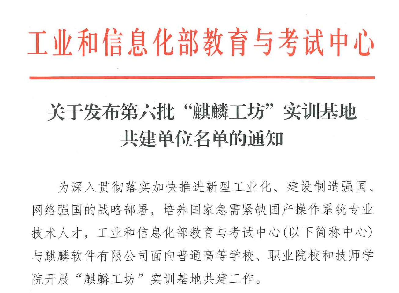 2025年7月22日,由工業和信息化部教育與考試中心聯合麒麟軟件有限公司共同組織的第六批“麒麟工坊”實訓基地共建單位名單正式公布。我校憑借扎實的辦學基礎、突出的專業實力和高質量的申報方案,成功入選,成為國家級信創產教融合平臺的共建院校之一。