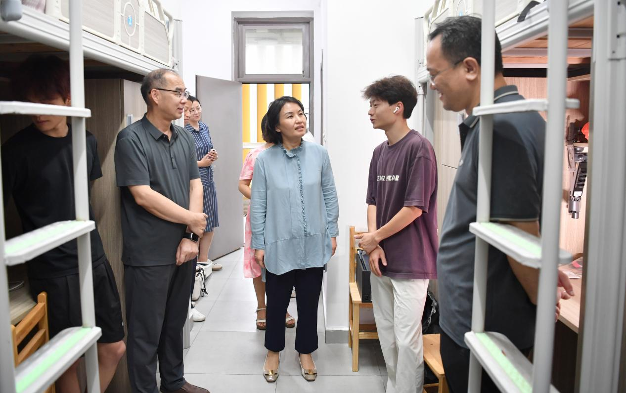 在學生宿舍,校領導與新生及學生家長親切交談,了解學生入住情況和學習生活需求,傾聽學生入學感受和學習規劃。彭慧表示,學校堅持圍繞師生、關照師生、服務師生的理念,竭力為同學們做好服務,幫助同學們解決學習和生活中的困難。