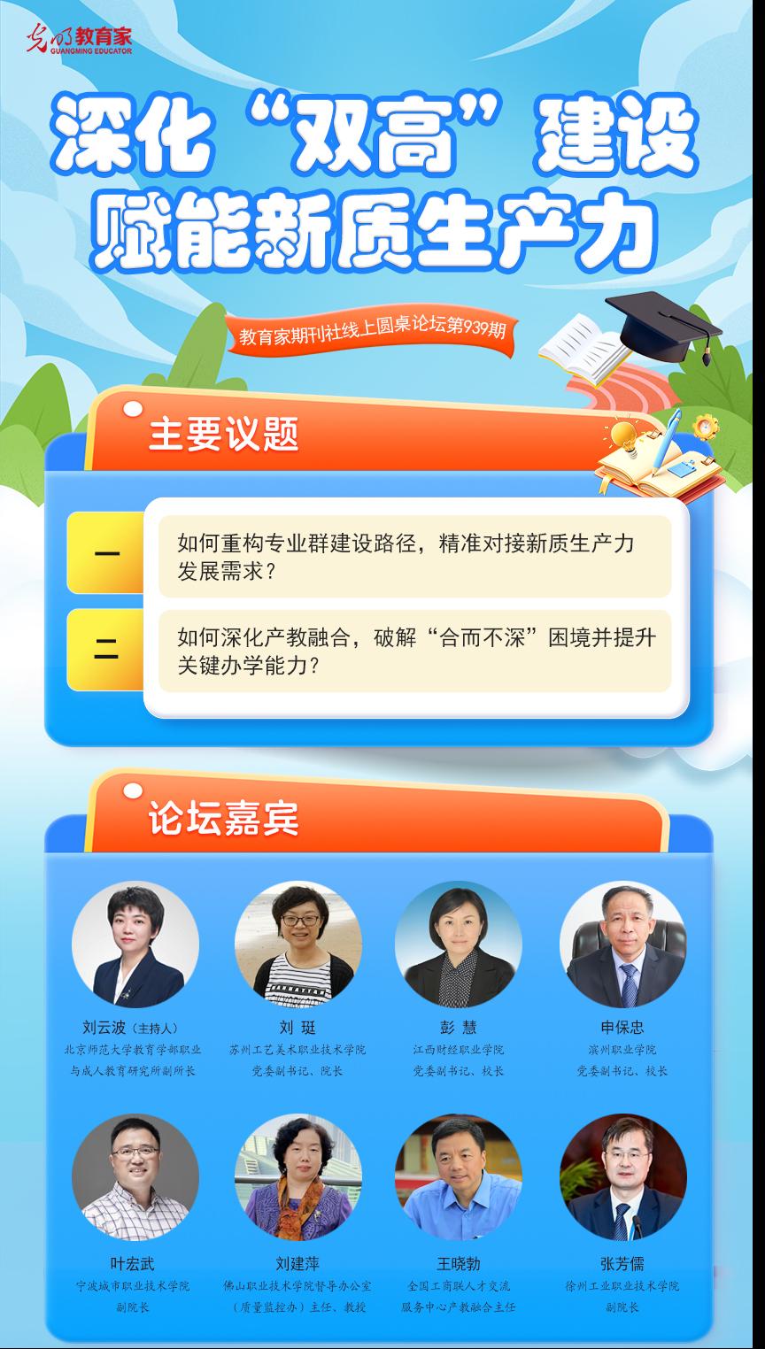 10月13日上午,由光明日報《教育家》雜志社主辦的第939期線上圓桌論壇成功舉辦。本次論壇以“深化‘雙高’建設 賦能新質生產力”為主題,邀請了包括蘇州工藝美術職業技術學院在內的6所職業院校和相關單位進行經驗分享。校黨委副書記、校長彭慧作為特邀嘉賓出席論壇,并作題為《深化產教融合 培育現場工程師新質人才》的專題發言。