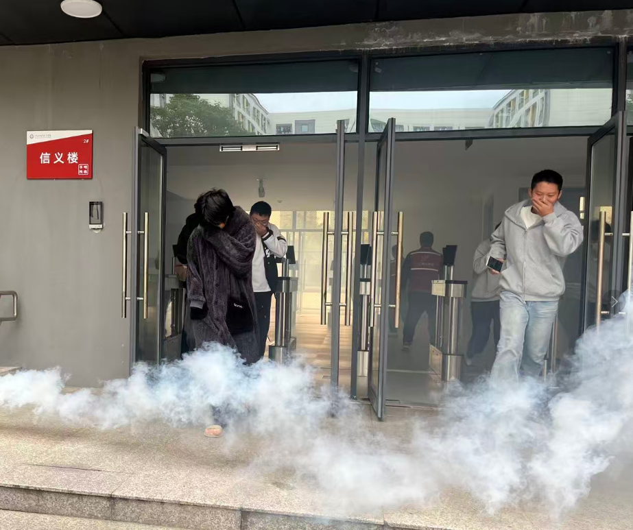 演練前,安全保衛處結合宿舍建筑布局制定方案,明確疏散路線、集合點及負責人,并通過企業微信、班會等多渠道,向學生普及“低姿彎腰、濕巾捂鼻、沿標識撤離”等要點,確保參訓人員知曉流程、掌握技能。