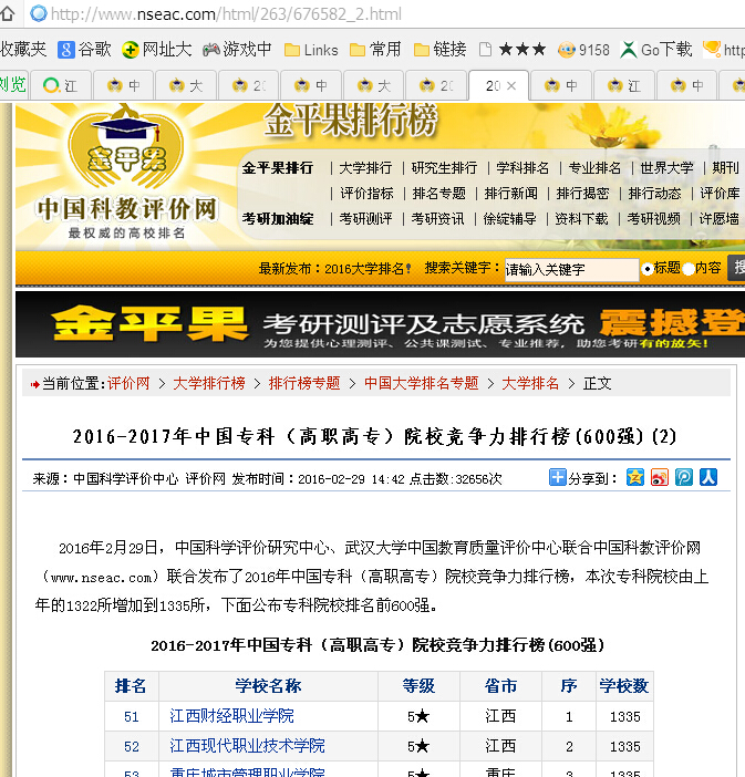 2016年2月29日,中國科學評價研究中心、武漢大學中國教育質量評價中心聯合中國科教評價網(www.nseac.com)聯合發(fā)布了2016年中國專科(高職高專)院校競爭力排行榜。我校競爭力為5星級(最高等級),在全國1335所高職高專院校中排第51名、江西省第1名。