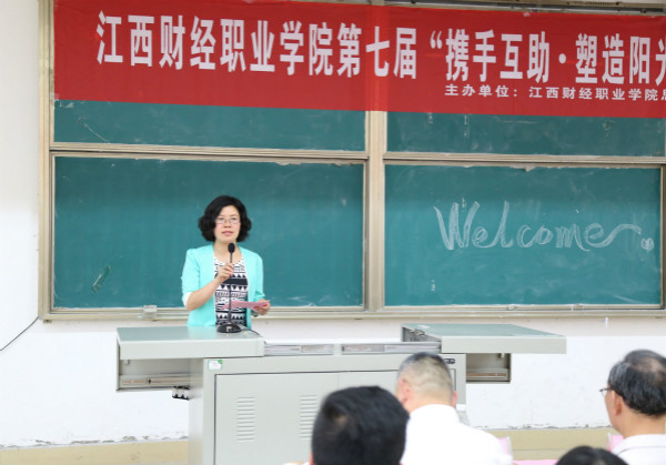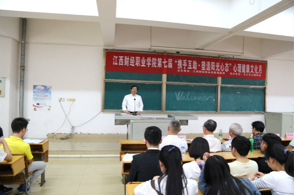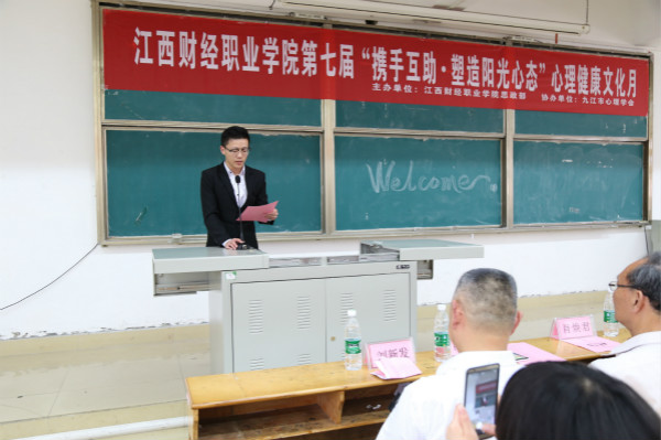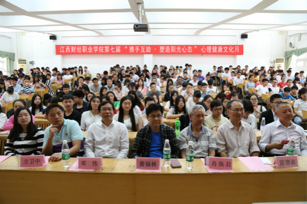 為秉承我校“務(wù)實(shí)、責(zé)任、合力”的精神,落實(shí)“五有”教育觀,培養(yǎng)“四具備”人才,推動(dòng)“四導(dǎo)工作”,深化“心理疏導(dǎo)”,豐富校園文化生活,關(guān)注青年學(xué)子心靈成長(zhǎng),同時(shí)也為了更好地迎接“5.25”大學(xué)生心理健康日的到來(lái),5月4日下午4:30,由我校思政部主辦、九江市心理學(xué)會(huì)協(xié)辦,以“攜手互助?塑造陽(yáng)光心態(tài)”為活動(dòng)主題的“江西財(cái)經(jīng)職業(yè)學(xué)院第七屆心理健康文化月”開(kāi)幕式在綜合樓階梯教室五隆重舉行。