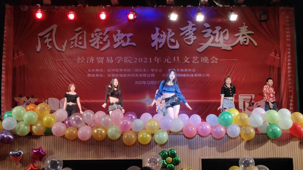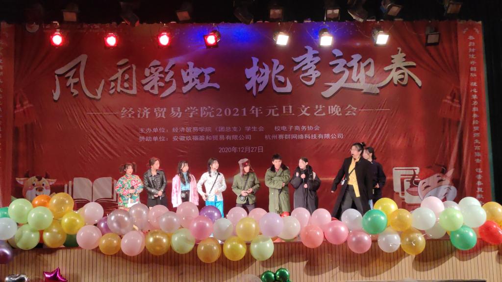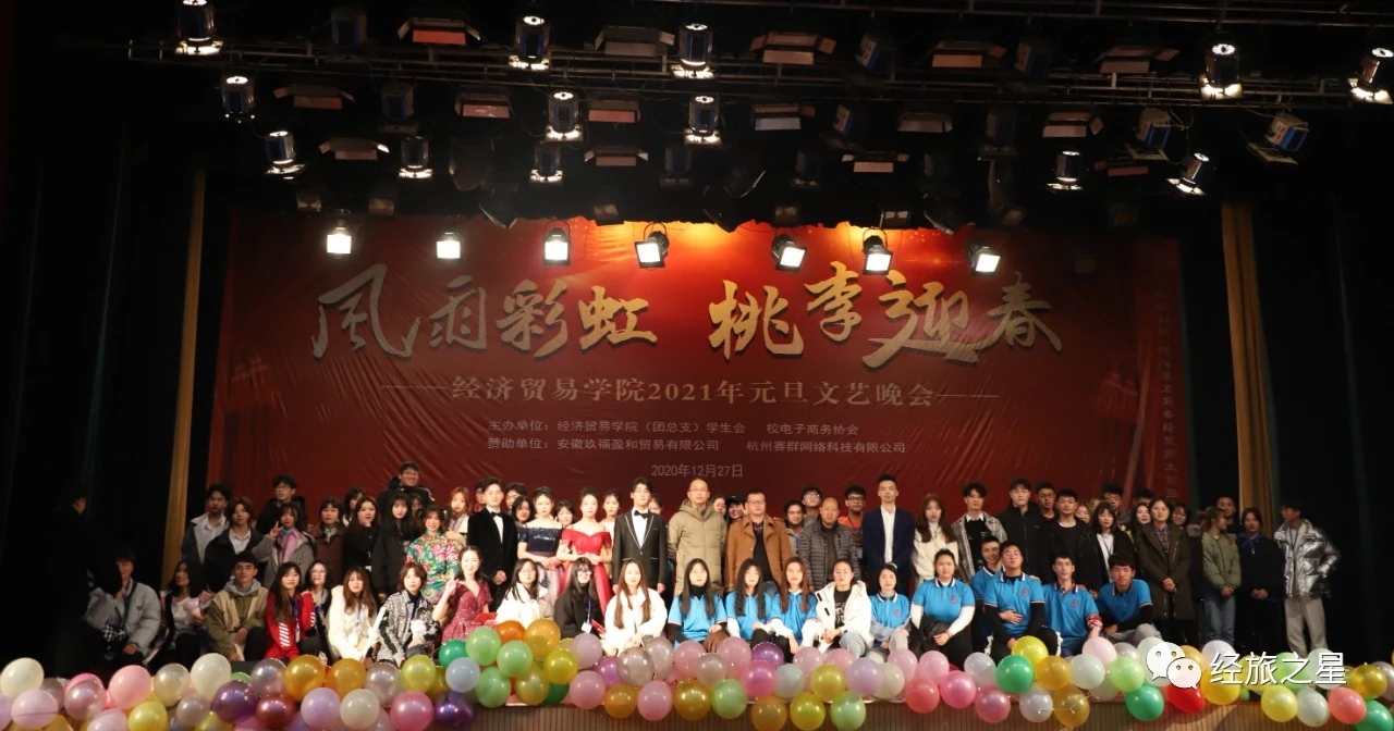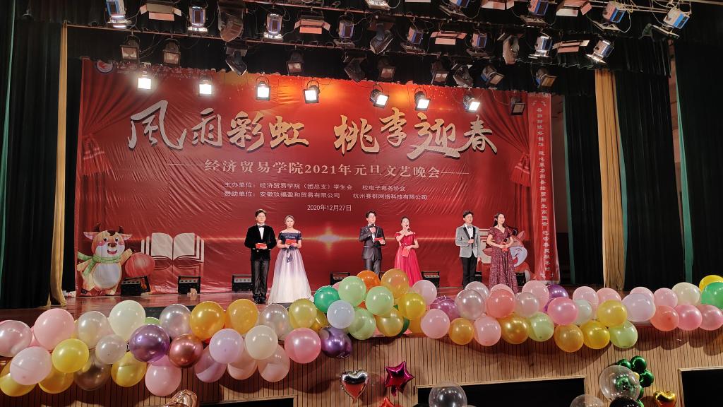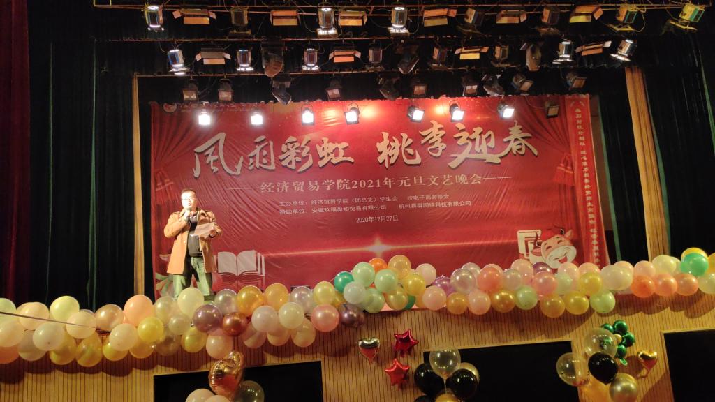 值此辭舊迎新之際,經濟貿易(旅游管理)學院2021“風雨彩虹、桃李迎春”元旦文藝晚會暨優秀學生頒獎典禮于2020年12月27日晚19點在校英才交流中心隆重舉行。經濟貿易學院黨政領導、杭州賽群網絡有限公司院校負責人、以及我院師生一千余人到場觀看。晚會十佳大學生獎品由安徽玖福盈和貿易有限公司贊助支持。