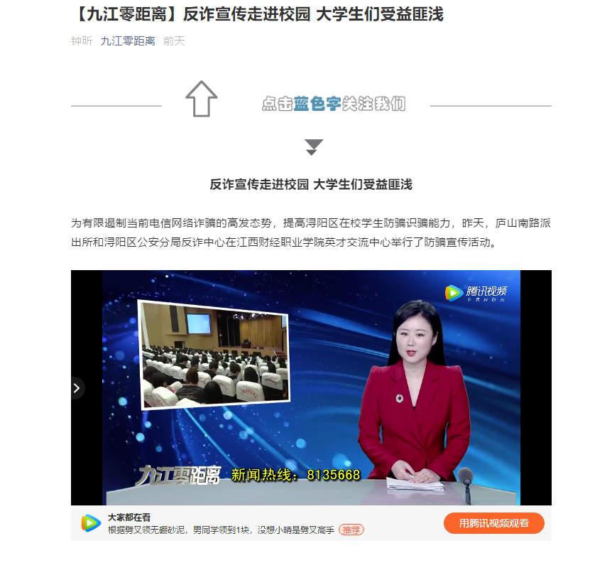 2021年3月9日下午,校宣傳統戰處、團委、保衛處、財稅金融學院聯合九江市公安局潯陽分局反詐中心、廬南派出所以“反詐宣傳進校園 保駕護航促成長”為主題舉辦校園安全教育專題講座,九江零距離、九江廣播等新聞媒體持續關注并報導。