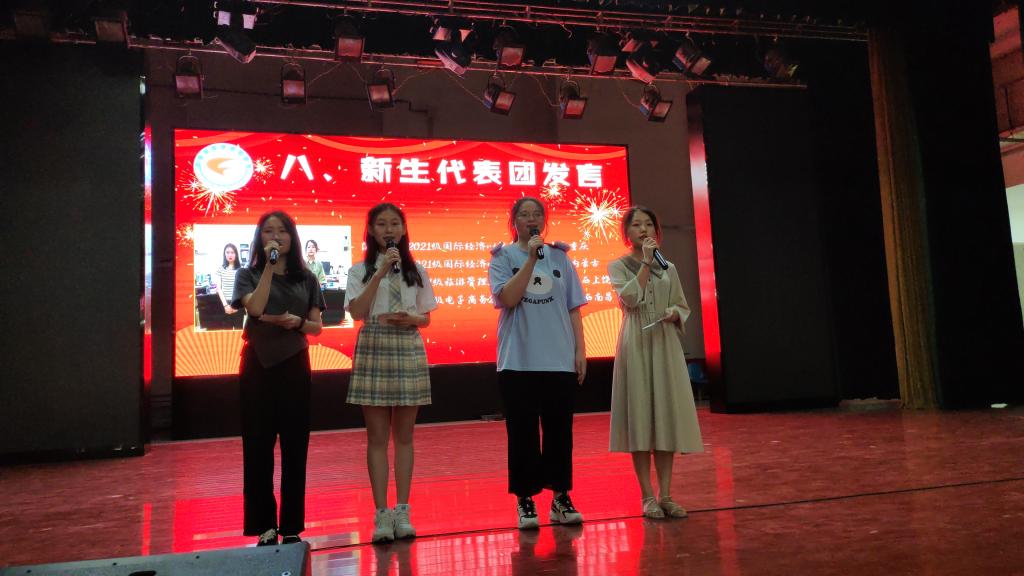 2021級新生代表團講話,表達了新入校的激動之情,對老師、學長學姐細心關愛的感激之情,對美麗校園的喜愛之情,和對學院文化、專業實力的信賴之心。并代表2021級全體新生宣誓承諾:一定嚴守校紀校規、勤奮刻苦學習、講究文明禮貌、團結合作互助,要做一個有理想、有道德、有文化、有紀律的經貿人!