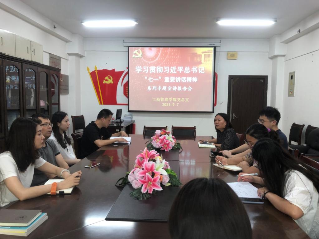 為深化對習近平總書記“七一”重要講話精神的理解和把握,9月7日下午四點半,工商管理學院黨總支組織全體教師黨員觀看了黨史學習教育中央宣講團成員吳德剛的“學習貫徹習近平總書記‘七一’重要講話精神專題宣講報告會”。