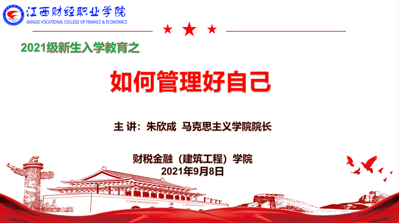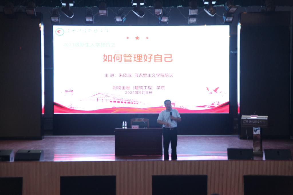 2021年9月8日,財(cái)稅金融(建筑工程)學(xué)院在英才交流中心成功舉辦2021級(jí)新生入學(xué)教育系列之“如何管理好自己”講座。講座由校馬克思主義學(xué)院朱欣成院長(zhǎng)主講。2021級(jí)聯(lián)培本科生和2021級(jí)專科新生共720余人參加學(xué)習(xí)。