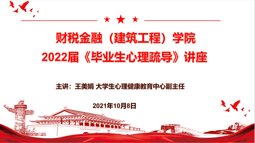 2021年10月8日,財稅金融(建筑工程)學院在英才交流中心舉辦《高職畢業班學生心理疏導》講座。講座由校大學生心理健康教育中心副主任王美娟主講,2022屆畢業生900余人參加學習。