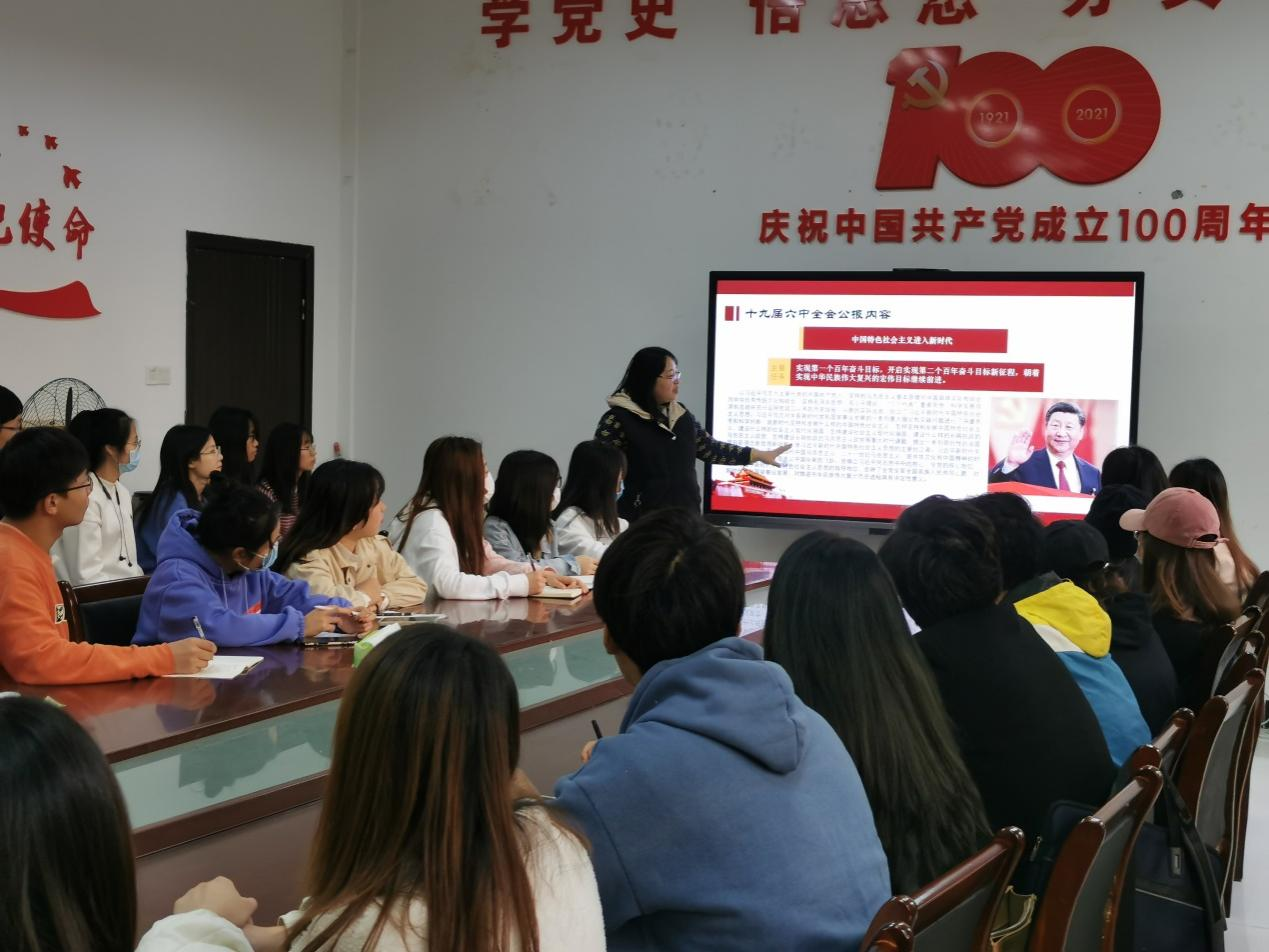 宋曉婷為全體同學梳理了十九屆中央委員會歷次全會的主題,和大家一起學習了十九屆六中全會公報全文內容,并重點學習了為什么要總結黨的百年奮斗重大成就和歷史經驗、“四個偉大成就”、“五個歷史意義”和“十個堅持”。