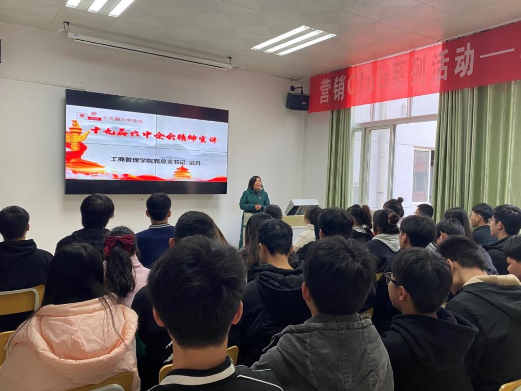 為增進學生對十九屆六中全會精神的理解,引導學生自覺踐行初心使命,將個人成長融入國家發展需要,工商管理學院黨總支于2021年12月17日下午4點30分在二訓4403室開展了十九屆六中全會精神宣講進班級活動。20級市場營銷2班全體同學參加,工商管理學院黨總支書記武丹作相關宣講。