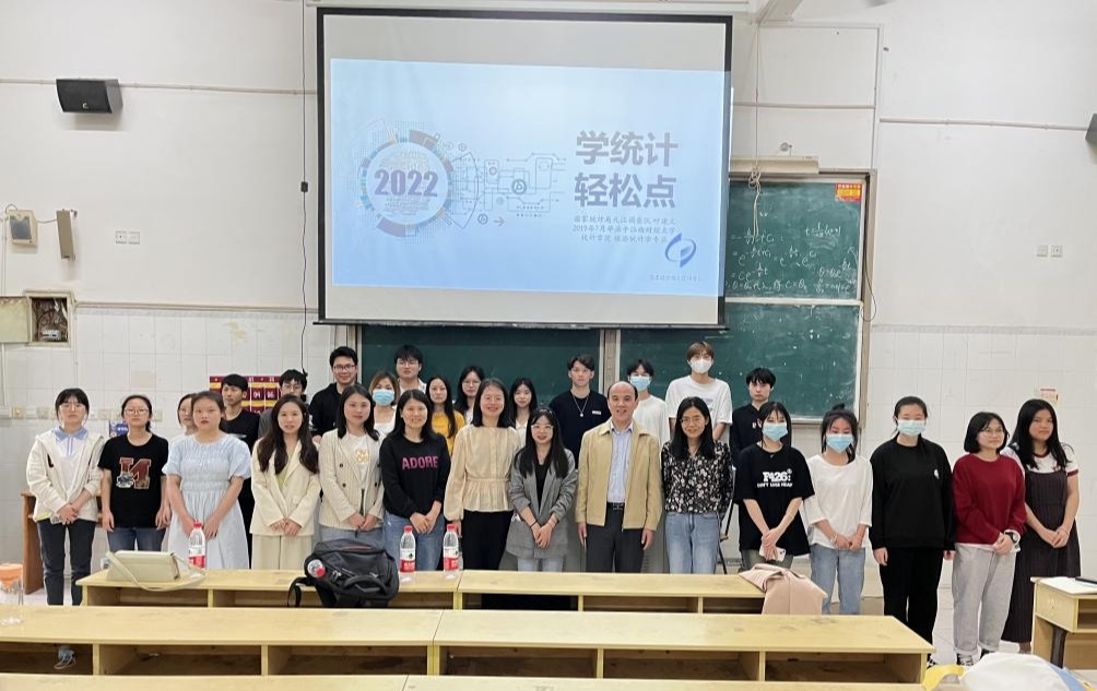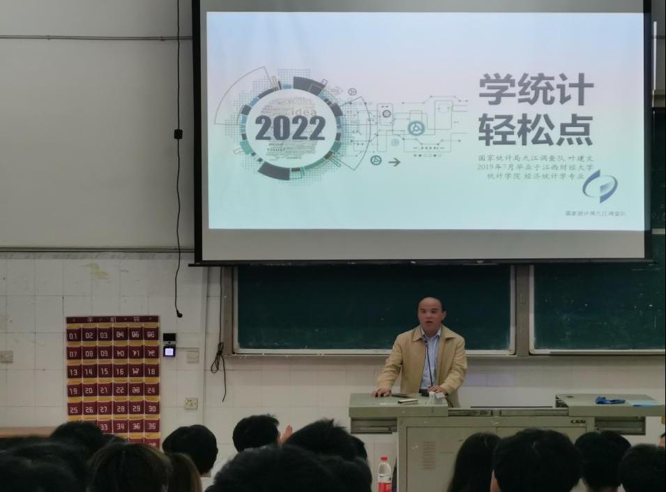 2022年4月22日下午,數(shù)字經(jīng)濟學(xué)院邀請國家統(tǒng)計局九江調(diào)查隊的技術(shù)骨干葉建文老師為21級統(tǒng)計類專業(yè)學(xué)生舉辦“學(xué)統(tǒng)計,輕松點”的專題講座。國家統(tǒng)計局九江調(diào)查隊綜合執(zhí)法科科長張璐璐、數(shù)字經(jīng)濟學(xué)院副院長李俊峰、統(tǒng)計調(diào)查教研室全體教師和100余名學(xué)生共同參加了這次講座。