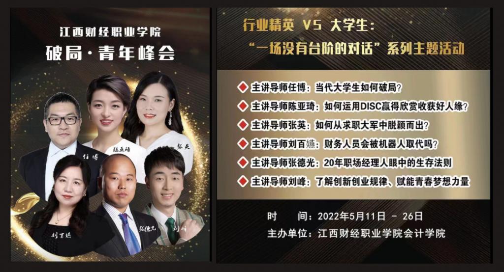 至此,會計學院首屆“破局·青年峰會:一場沒有臺階的對話”系列主題活動終于落下帷幕。2022年5月11日至5月26日,在為期2周的時間之內,我院青年學子與六位行業(yè)精英進行了六場對話: