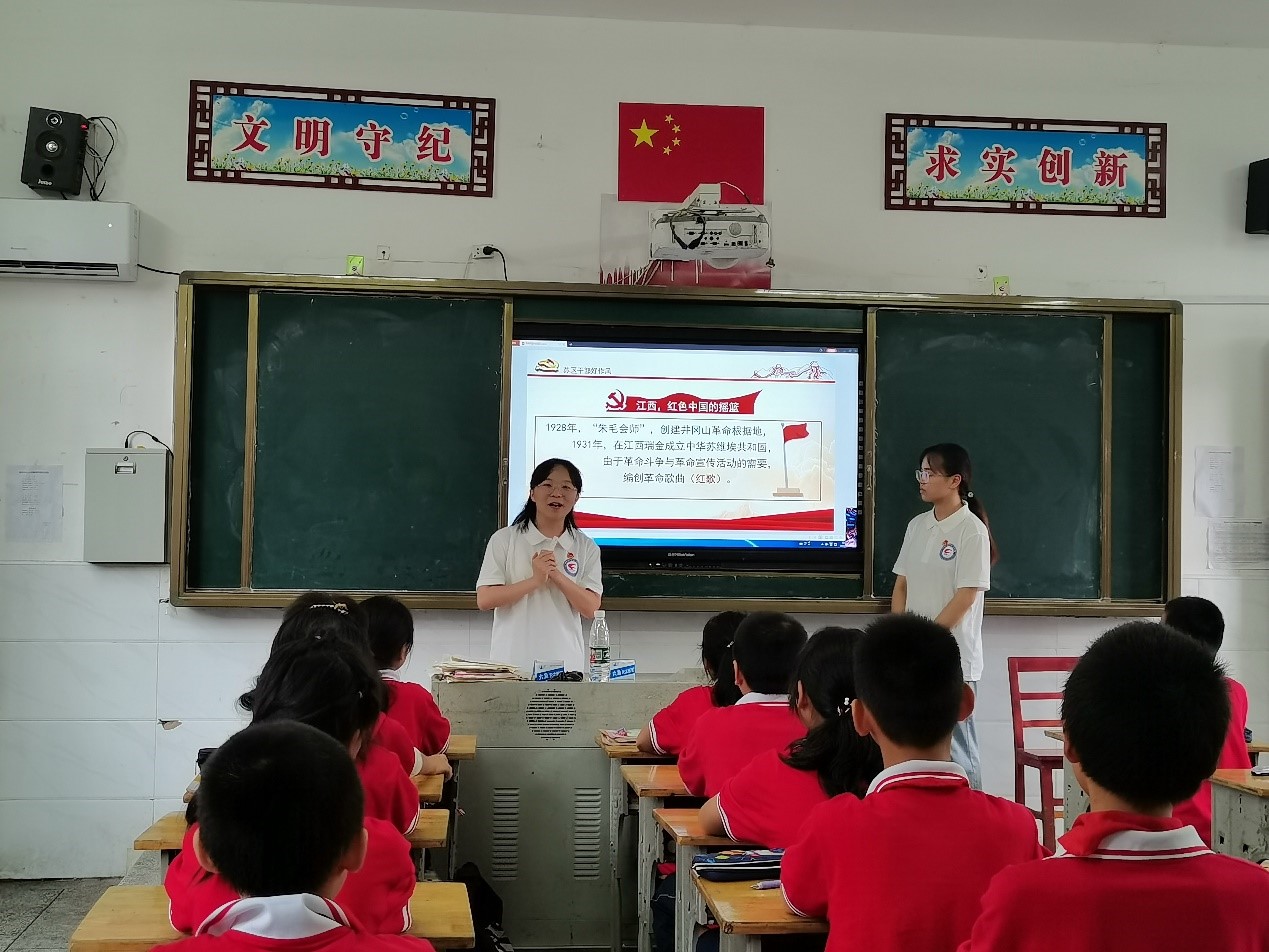 “青春心向黨 建功新時代”,為傳遞愛黨愛國愛社會主義熱情,青春筑夢社會實踐隊在高豐鎮中心小學給五年級(2)班的小朋友上一堂《蘇區干部好作風》的微團課。隊員結合小學生年齡實際,以視頻和幻燈片的形式,通過形象生動的語言向小學生講解蘇區精神。課上介紹了《蘇區干部好作風》歌詞意思,隊員一字一句的領唱教唱課堂氣氛逐漸活躍起來,小朋友積極參與,通過紅歌主動學習紅色革命精神。隊員通過此次微團課進一步引導小朋友們對黨和國家的認識,傳承紅色基因、賡續紅色血脈,為實現中華民族偉大復興中國夢譜寫新的篇章!