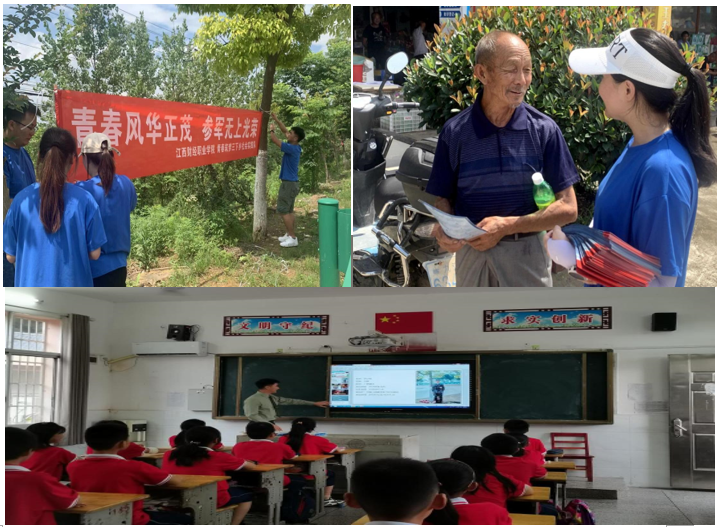 “國無防不立,民無兵不安”,為更好地宣傳征兵入伍工作,社會實踐隊赴瑞昌市高豐鎮樂豐村村民服務中心,為村民宣講征兵政策。在講解中鄉親們對隊員說:一人當兵全家光榮,保家衛國才是英雄本色。當日下午,隊伍中的退役大學生士兵在高豐中心小學給五年級的同學上了一堂“軍事教育理論課”,通過閱兵式視頻向小學生展現我們國家強大的軍事實力,讓小朋友們領悟了中國人民解放軍對保家衛國的重要性,并結合服役經歷分享自己參軍入伍的部隊生活,也希望小朋友從小“樹立參軍報國、建功軍營”的志向。