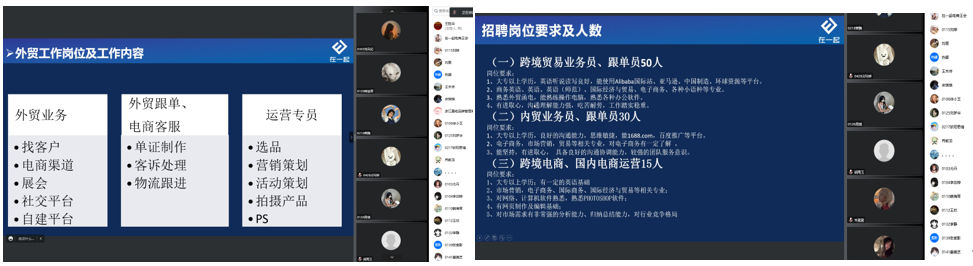經過前期充分考察和全面溝通,國際教育學院充分利用校友及校企合作單位等資源,邀請了浙江星屹品牌管理有限公司、東莞在一起電子商務有限公司、東莞市索艾電子科技有限公司、義烏市昕派服飾有限公司四家企業進行線上企業招聘宣講會。各企業負責人通過介紹企業文化、發展歷程、行業發展前景、人才需求、薪酬福利、晉升渠道以及人才培養計劃等內容來展現各自特色,從而匹配企業需求的人才資源。