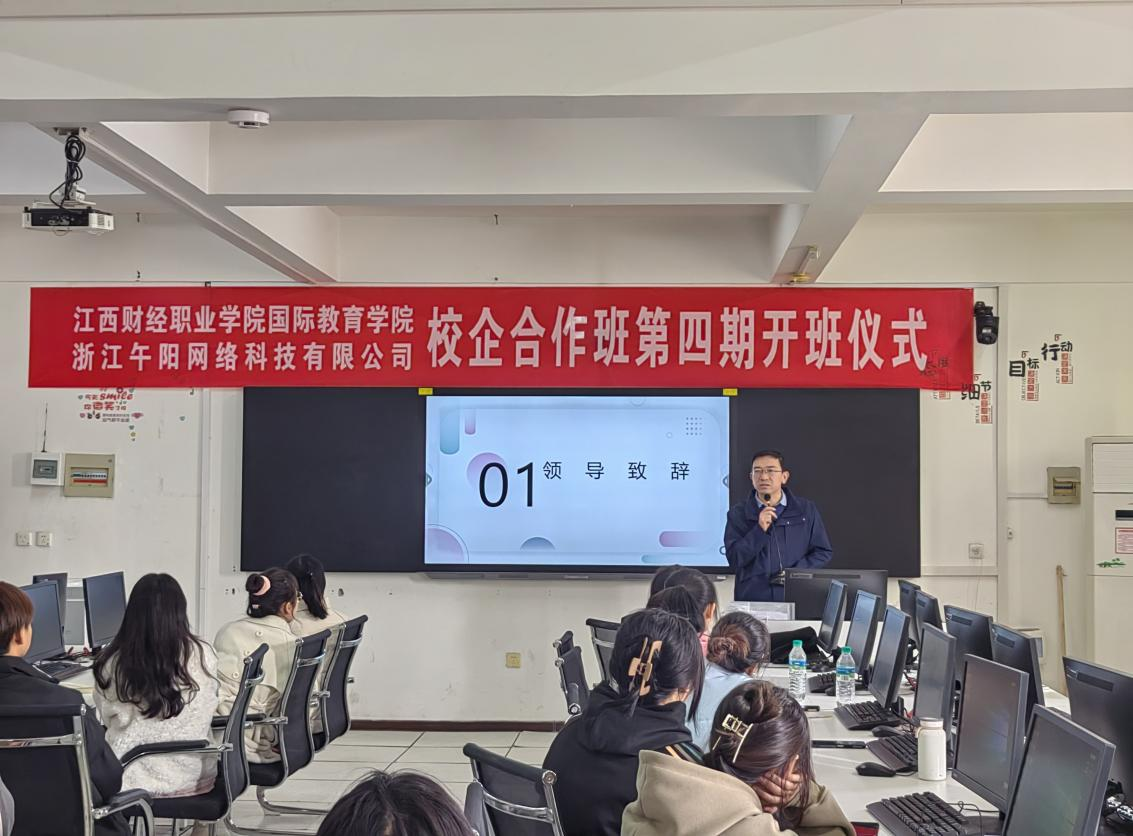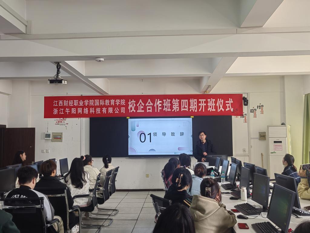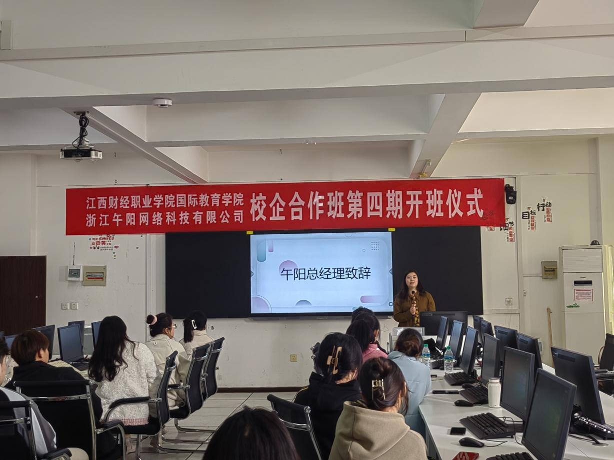 開班儀式上,國際教育學院黨總支書記王勝華代表學校致歡迎辭,介紹了學院基本情況和項目實施運行現狀,殷切希望同學們珍惜這次難得的機會,履行“午陽公司準員工和財經職院學生”的雙重身份,要嚴格遵守企業和學校的各項規章制度,刻苦學習,努力工作,在實踐中學真知、增本領。楊瑞副院長(主持工作)指出,此次第四期校企合作班開班是學院與午陽公司合作開展跨境電商人才,深化產教融合校企合作的進一步探索,希望跨境電商專業的學生珍惜機會、努力學習,掌握真本領、提升真水平。副書記歐陽倍祥對同學們選擇跨境電商校企合作班表示熱烈祝賀,并希望同學們學有所用,學有所成。