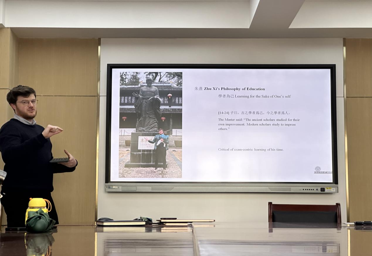 本次教研會邀請了我校來自加拿大的外籍教師Dallas擔任主講,他圍繞以中西方文化和教育教學理念,結合自身經歷,為教師們介紹了亞、歐、美文化和中西方教育教學理念,交流過程中,Dallas表達了對中華傳統文化,尤其是對朱熹教育哲學思想的熱愛。