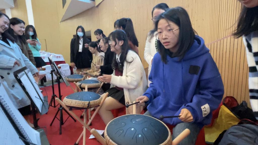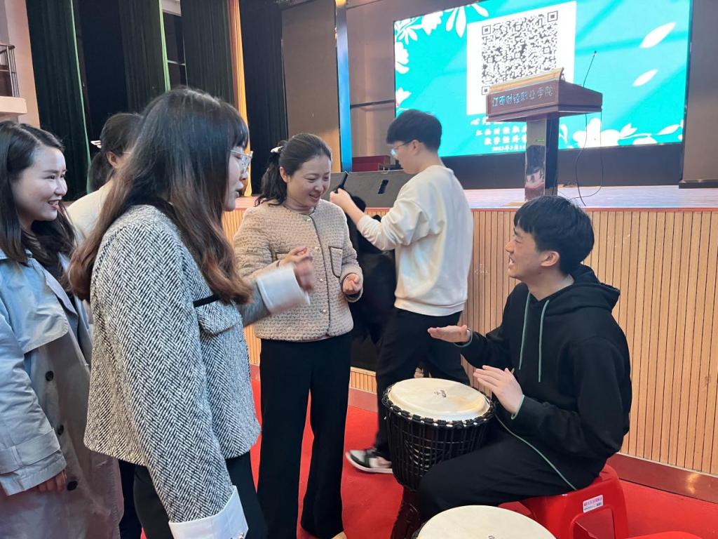 講座現場氣氛熱烈,同學們積極與主講人互動,通過《你畫我猜》小游戲了解到溝通的重要性。講座活動前后,團隊老師用空靈鼓和非洲鼓以音樂治療方式給同學們舒緩壓力,讓同學們不僅了解樂器在休閑娛樂時的有趣性,也讓他們在心靈上得到了放松,對大學生活更加充滿信心。